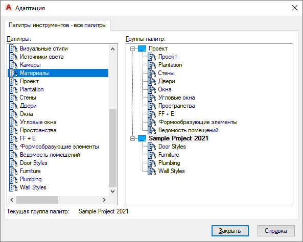 Если для проекта создается пустая группа инструментальных палитр, она не отображается в наборе инструментальных палитр после установки проекта текущим. Для ее отображения необходимо добавить хотя бы одну инструментальную палитру.