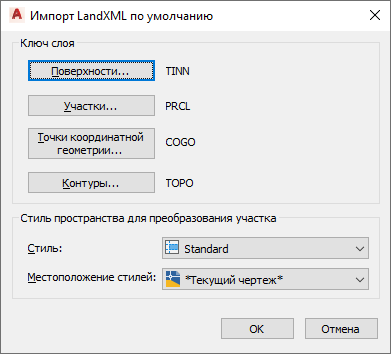 Если для LandXML данных не определены ключи слоев, импортируемые данные размещаются в стандартных ключах слоев, заданных для данных LandXML, TINN (Поверхности), PRCL (Участки), COGO (Точки COGO) и TOPO (Контуры).