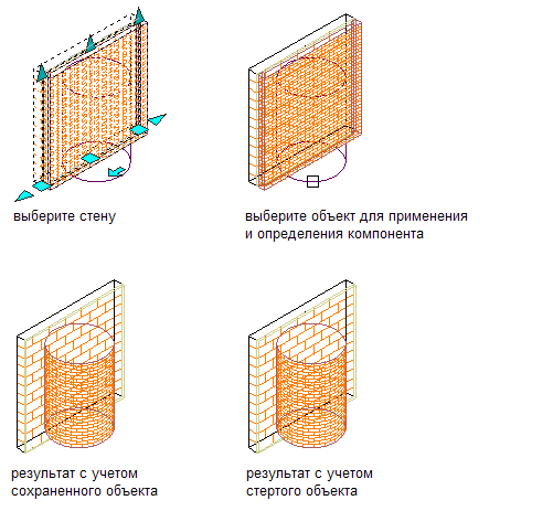 Данная процедура служит для создания трехмерного (3D) тела-модификатора и замены стены или компонента стены модификатором. Можно применить модификатор к однокомпонентной стене или к выбранному компоненту в многокомпонентной стене.