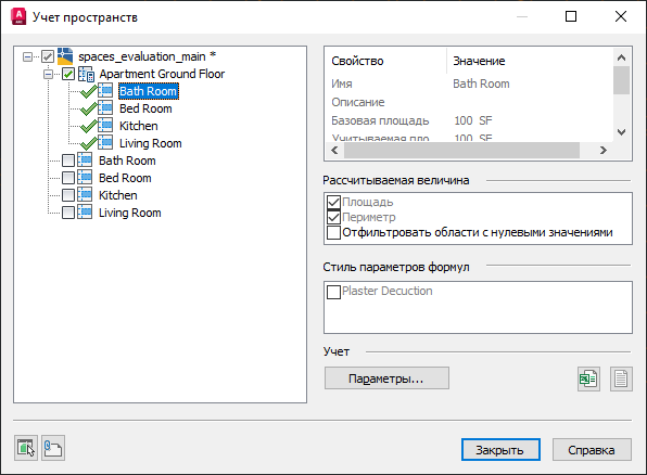 - Выберите пространства и зоны, которые требуется включить в процедуру учета для плана этажа, установив для них соответствующие флажки.
