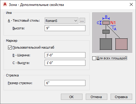 Данная процедура позволяет задать для зоны стиль текста, размер обозначения зоны и стрелку соединительной линии зоны. В дополнительных свойствах можно также указать, для каких пространств будет использоваться штриховка зоны (только для непосредственно прикрепленных пространств или также для пространств, прикрепленных через субзоны).