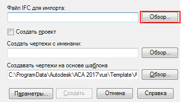 - В диалоговом окне "Импорт файла IFC и создание чертежей" в разделе "Файл IFC для импорта" щелкните "Обзор".