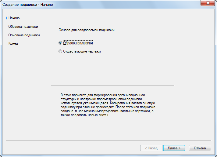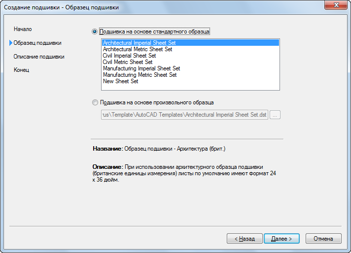 | использовать образец подшивки из списка, | установите флажок "Подшивка на основе стандартного образца", выберите подшивку из списка и нажмите "Далее". |
