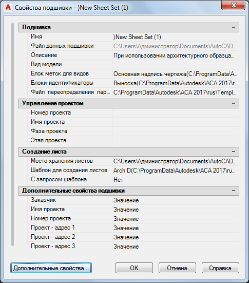 При использовании шаблона подшивки для проекта инструментарий AutoCAD Architecture 2026 нет необходимости в заполнении следующих полей.