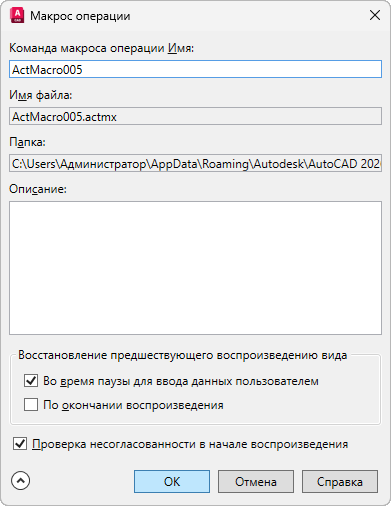Можно сохранить или переименовать текущий макрос операции и определить поведение при его воспроизведении. Отображение этого диалогового окна можно отключить, сняв флажок "Запрос имени макроса операции" в диалоговом окне "Установки рекордера операций".