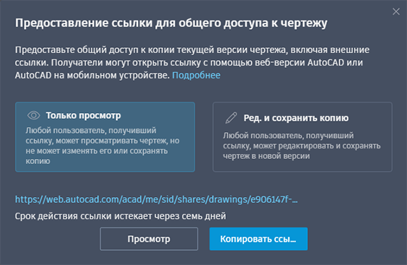 Предоставление общего доступа к копии текущего чертежа для просмотра или редактирования в AutoCAD в интернете (web.autocad.com) или AutoCAD на мобильном устройстве. Копия чертежа включает все внешние ссылки и изображения.