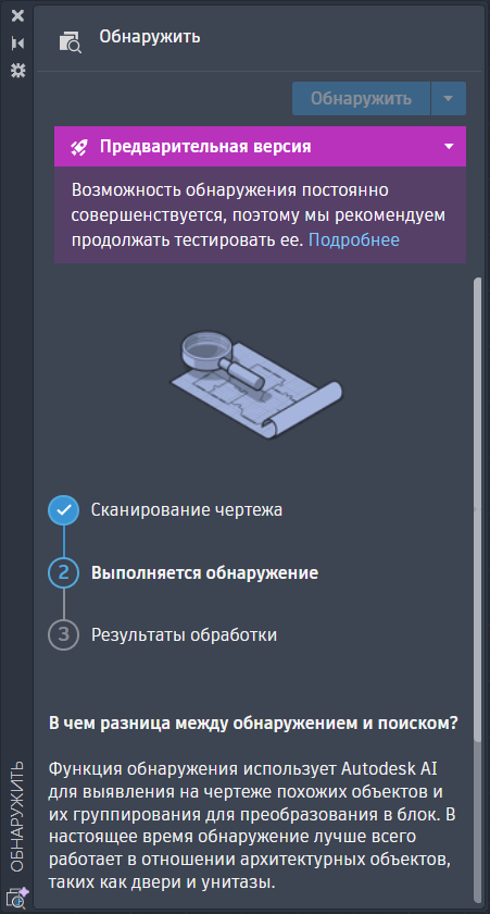 Палитра «Обнаружение» предоставляет параметры для сканирования чертежа и просмотра выявленных объектов, которые можно преобразовать в блоки.