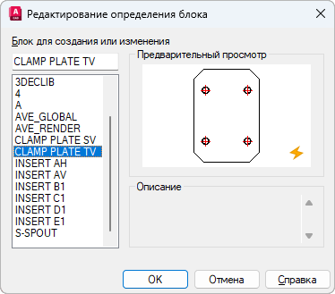 Выберите в списке сохраненные в чертеже определения блоков, которые будут отредактированы в редакторе блоков. Можно также ввести имя нового определения блока, который необходимо создать в редакторе блоков.
