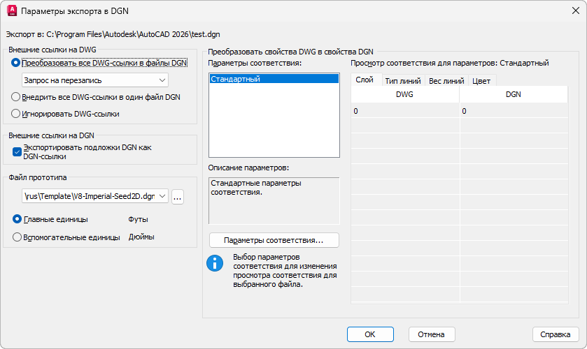 Позволяет выбрать и настроить параметры соответствия, используемые для текущего экспорта в DGN.