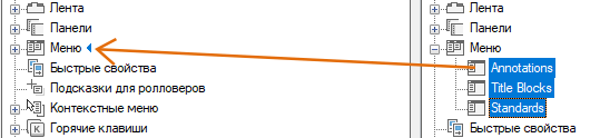 В левой панели щелкните на знаке "плюс" (+) рядом с узлом элементов интерфейса, чтобы открыть список. Откройте соответствующий список в правой панели.
