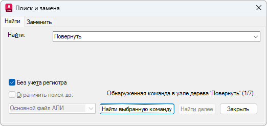 Отобразится сообщение с подробной информацией о местонахождении команды, ее точном положении на панели "Адаптации" или "Свойства", а также о количестве вхождений команды.