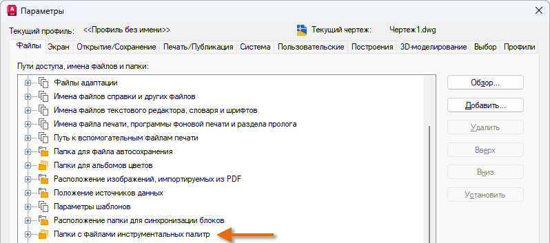 Файлы инструментальных палитр содержат стандартные и пользовательские инструменты. Файлы сохраняются в директориях, указанных в параметре "Местонахождение файлов инструментальных палитр".