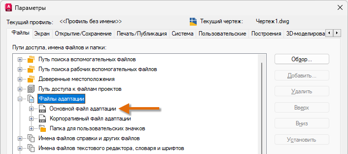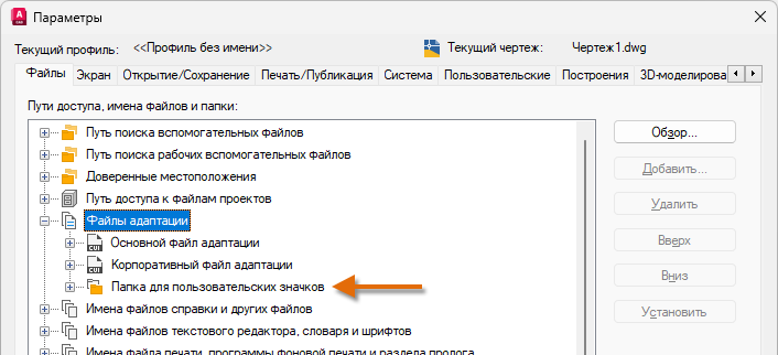 Пользовательские профили являются именованными коллекциями приложения и настройками среды чертежа. Эти настройки включают в себя цвет окна чертежа, размер курсора, шрифт окна команд, орфографический словарь и т. д.