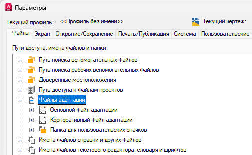 - На вкладке "Файлы" диалогового окна "Параметры" щелкните на знаке "плюс" (+) рядом с узлом "Файлы адаптации", чтобы развернуть его.