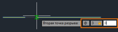 С помощью относительных координат можно указать вторую точку разрыва объекта. В примере ниже создается зазор на линии на три единицы справа.