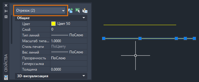 В раскрывающемся списке «Тип объекта» в верхней части палитры свойств будет отображено Отрезок (2).