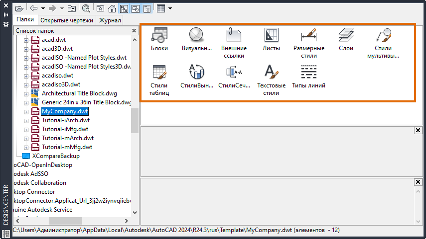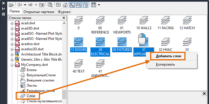 Все стили и слои шаблона теперь доступны в текущем чертеже. Существующие стили и слои с одинаковыми именами не изменятся.