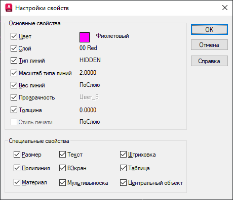 Из специальных свойств применяются только те, которые относятся к типу исходного объекта. Для размерных объектов это такие свойства, как размерный стиль и другие параметры.