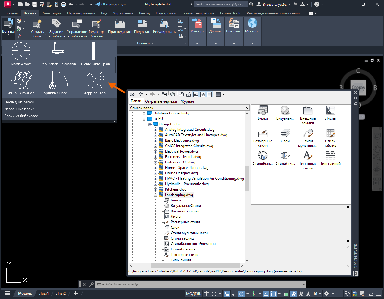 Теперь именованные стили, блоки и параметры чертежа, заданные в файле Landscaping.dwg, будут доступны в шаблоне «Мой шаблон».