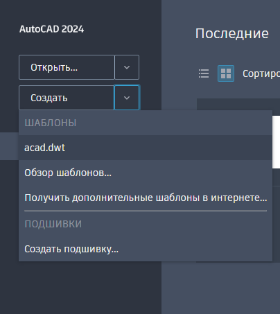 Прим.: Начиная с версии AutoCAD 2022, можно щелкнуть раскрывающийся список «Создать», чтобы открыть список шаблонов, установленных вместе с AutoCAD.