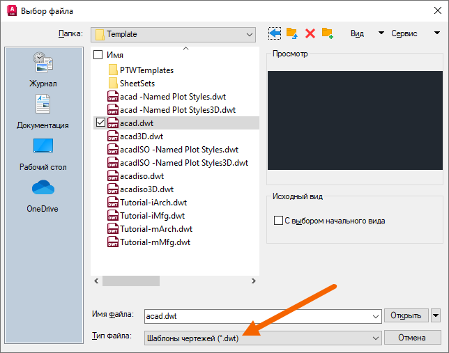 2. В раскрывающемся списке «Тип файла» выберите «Шаблон чертежа (*.dwt)».