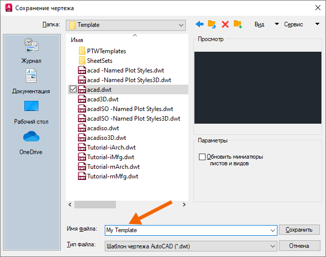 Подумайте, какие параметры должны быть настроены в новом чертеже и добавьте их в шаблон «Мой шаблон».