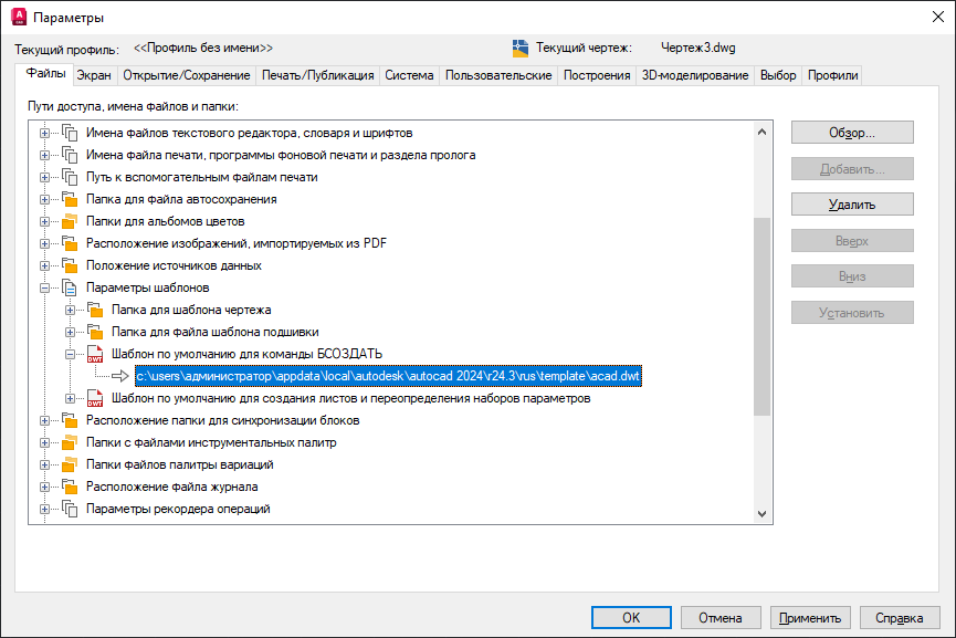 Изменение шаблона по умолчанию для нового чертежа