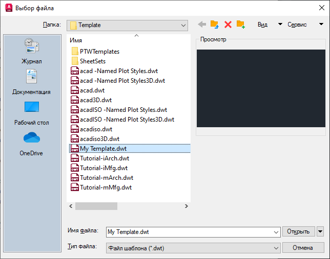 Прим.: Шаблоны можно перенести в папку с общим доступом, чтобы все пользователи AutoCAD в компании имели возможность работать с ними. При переносе в другую папку список шаблонов в соответствующем разделе обновляется.