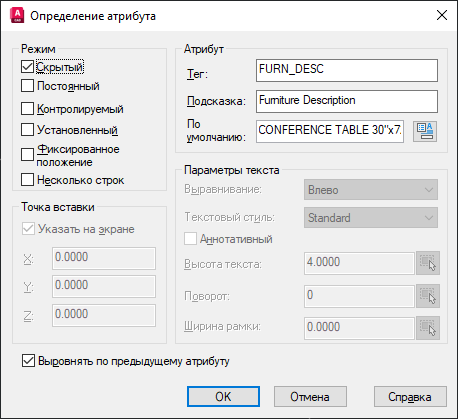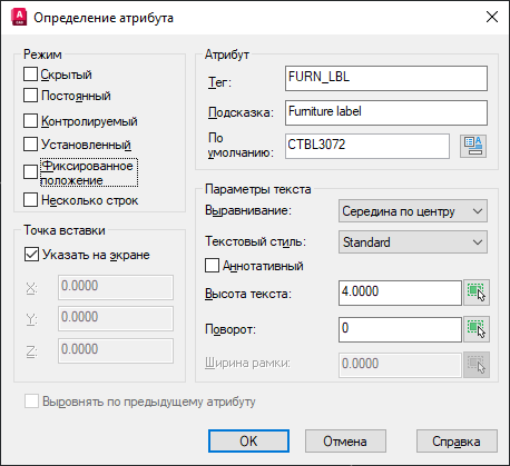 - Примите представленные значения и укажите точку вставки атрибута, лучше всего для этого подходит точка внутри геометрии, которая определяет стол.