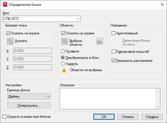 - В диалоговом окне «Определение блока» укажите значения, как показано на следующем рисунке:
