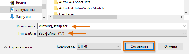 В текстовом поле «Имя файла» выделите текст по умолчанию и введите drawing_setup.scr.