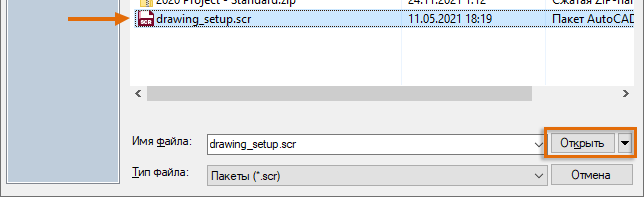 В диалоговом окне «Выбор файла сценария» найдите и выберите файл сценария drawing_setup.scr.