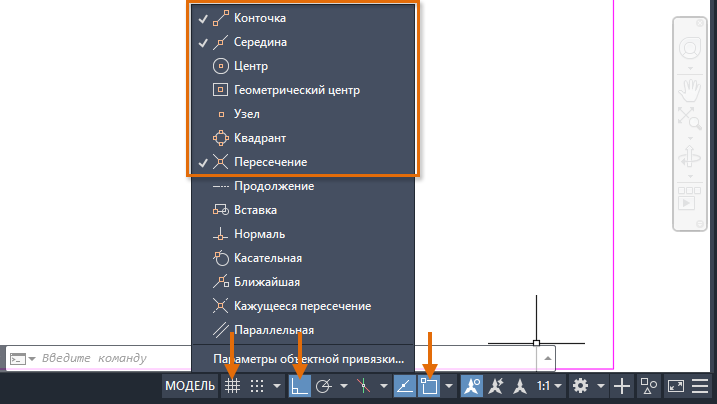 задает объектные привязки к конечной точке, средней точке и пересечению;