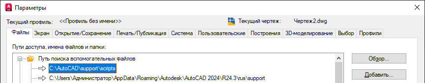 Файлы сценариев можно запускать из любых папок, но рекомендуется хранить их в общедоступной папке, указанной в разделе «Путь поиска вспомогательных файлов» в AutoCAD. Так файлы сценариев будут находиться вместе с другими пользовательскими файлами, и это облегчит работу с ними.