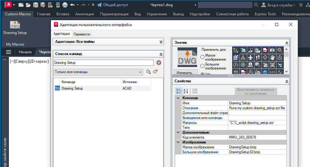 Можно создать макрос, использующий команду ПАКЕТ, чтобы выполнять конкретный сценарий при нажатии кнопки на ленте. Ниже приведен пример макроса, который вызывает команду ПАКЕТ и запускает файл сценария drawing_setup.scr.