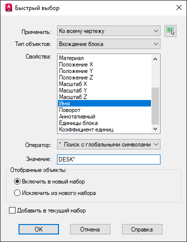 Прим.: Параметр «Имя» соответствует именованным объектам (именам блоков), а также типу объектов без имени (отрезкам и окружностям).