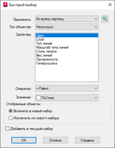 SELECTSIMILAR. Ищет все объекты, соответствующие свойствам выбранных объектов, и добавляет их в новый набор.