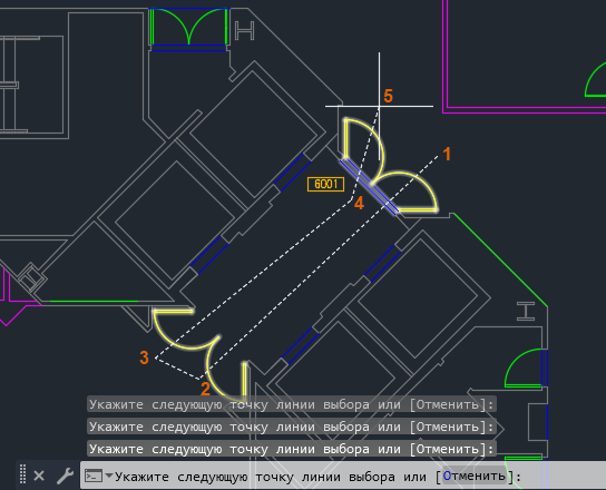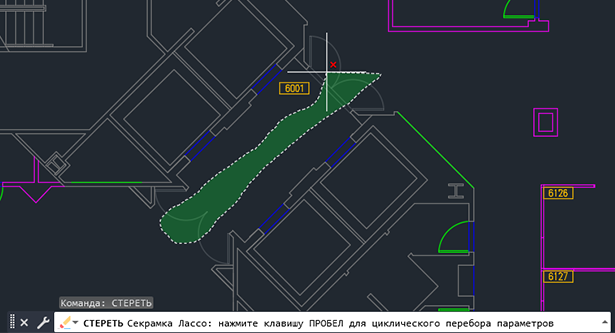 Обратите внимание, что в командной строке указано, что в данный момент используется секущее лассо, то есть выбираются все объекты, пересекаемые лассо и заключенные в него.