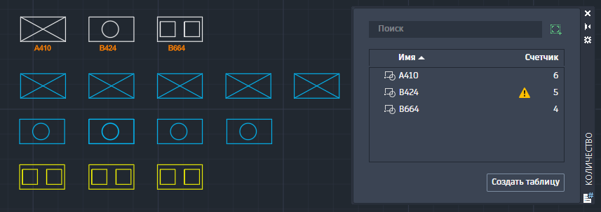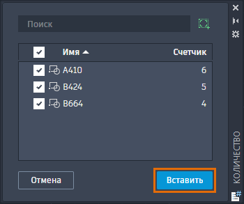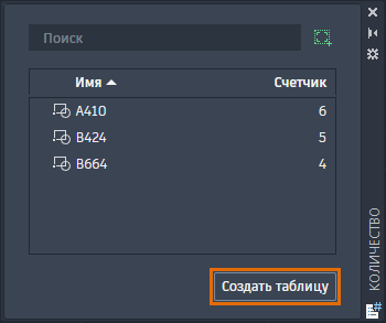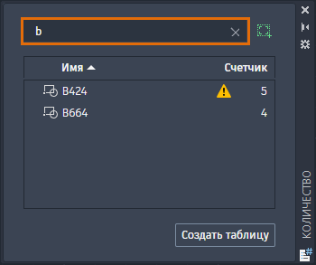 На палитре «Количество» отображаются имена блоков, которые начинаются с вводимых символов. Это удобно, если требуется быстро найти блоки и их количество на основе имени.