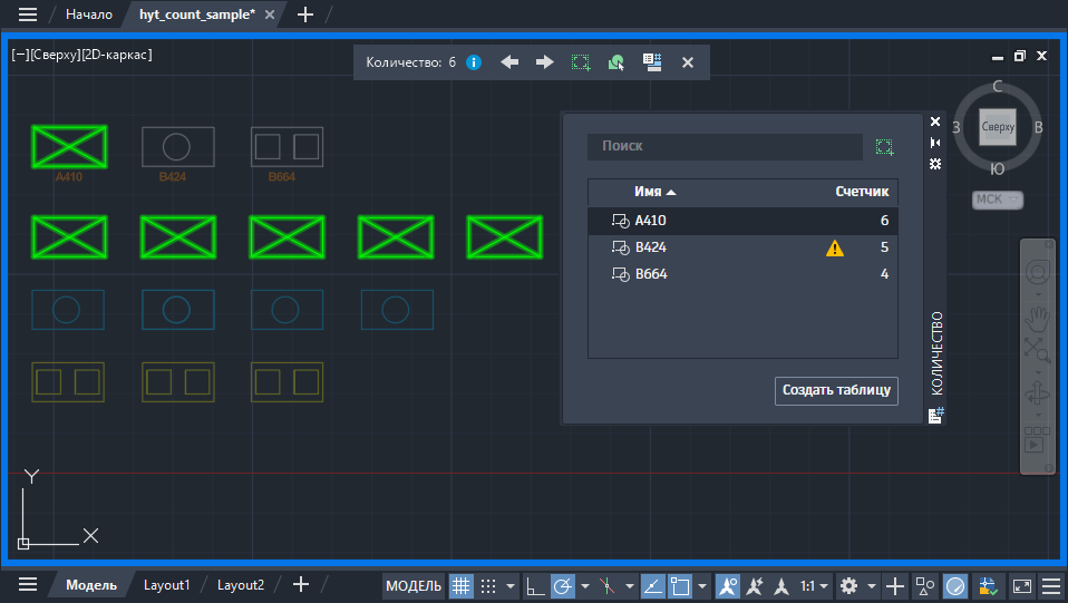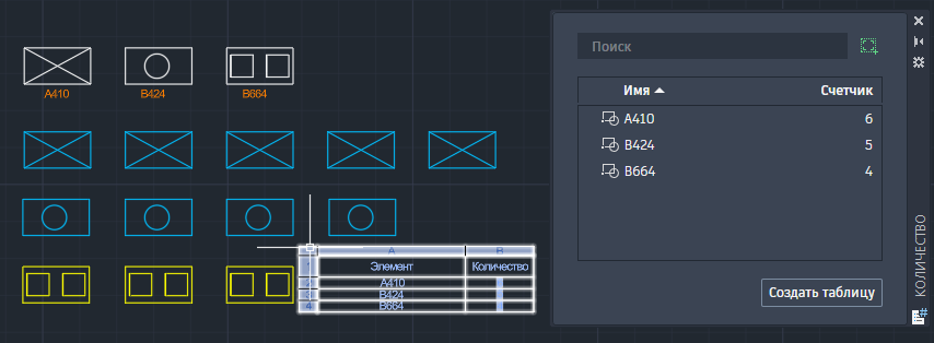 Иногда требуется полный обзор чертежа, например при проверке проекта или создании перечня компонентов проекта. С помощью параметра «Количество» можно с легкостью перечислить блоки и их количество в таблице.