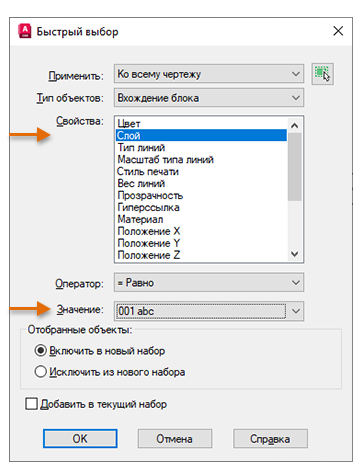 В настоящий момент выбраны все блоки на слое 001 abc. Обратите внимание, что в поле «Применить» автоматически выбрано значение «К текущему набору», как показано ниже.