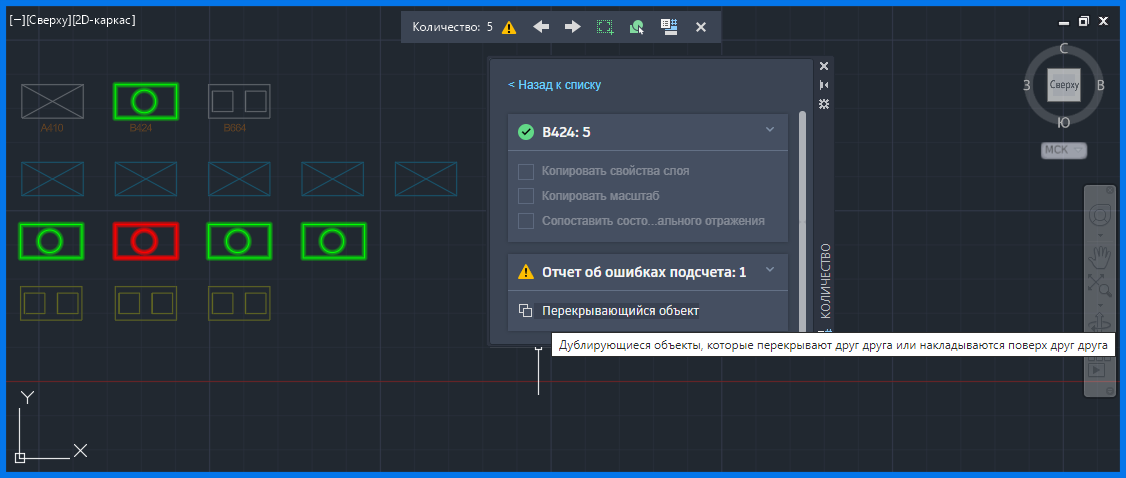 Функция «Количество» обеспечивает быстрый и эффективный подсчет экземпляров блоков и многих других типов объектов в пределах указанной области или на всем чертеже. Она повышает удобство работы для пользователя, представляя визуальные результаты, включая выделение подсчитанных экземпляров и подробные сведения, отображаемые на палитре и панели инструментов «Количество». Данная функция также включает функцию создания отчетов об ошибках, с помощью которой можно выявить потенциальные несоответствия и обеспечить точность чертежа.