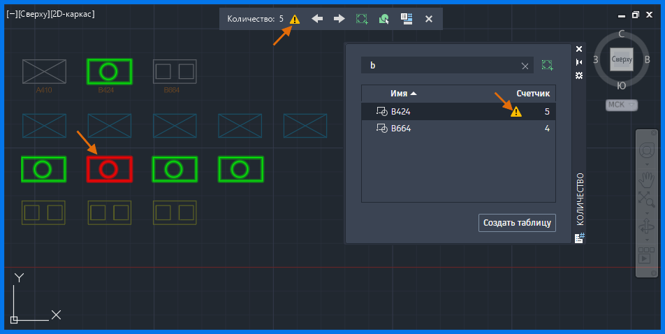 Выделяются блоки B424. В этом примере на палитре «Количество» и панели инструментов «Количество» отображается значок предупреждения (