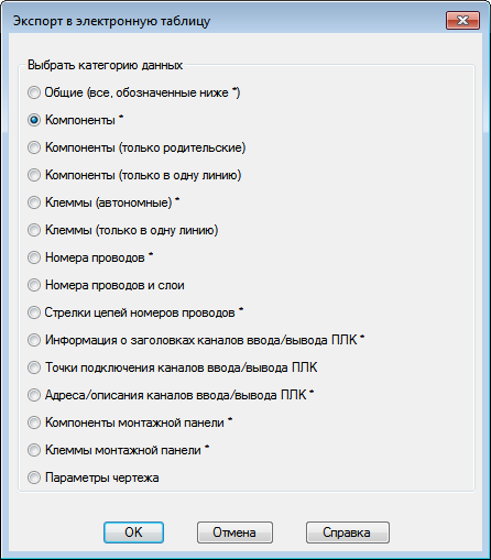 Если выбирается опция "Общие", то извлекается информация для категорий, отмеченных звездочкой (*). Каждая категория сохраняется на отдельном листе (формат электронной таблицы) или в таблице (формат базы данных). Форматы с разделением символами табуляции или запятыми не доступны при записи нескольких категорий.