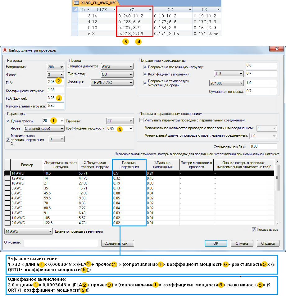 Предлагаемый диаметр провода определяется по соответствующей таблице AMPG* в файле базы данных стандартов Electrical.