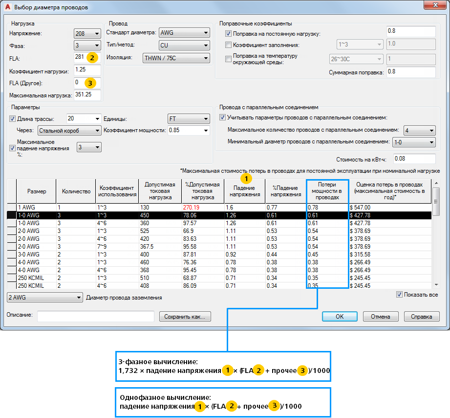Указывает, отображаются ли варианты параллельного соединения проводов. Если этот флажок установлен, отображаются записи, предусматривающие наличие двух или более проводников меньшего диаметра для каждой фазы с учетом требований допустимой токовой нагрузки. |