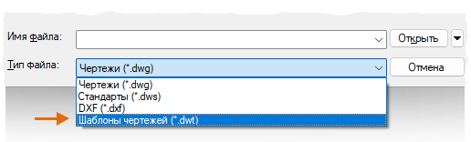 При работе в одиночку можно создавать файлы шаблонов чертежей в соответствии с собственными рабочими требованиями, и со временем, приобретя больше опыта, менять настройки для реализации тех или иных функциональных замыслов. Чтобы изменить существующий файл шаблона чертежа, нажмите кнопку «Открыть», в диалоговом окне выбора файла укажите тип файла «Шаблоны чертежей (*.dwt)» и выберите соответствующий файл.