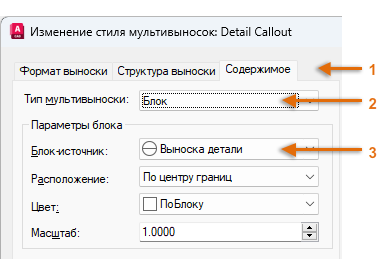 Например, для создания стиля выносного элемента запустите команду МВЫНОСКАСТИЛЬ. В Диспетчере стилей мультивыносок нажмите "Создать" и выберите описательное имя для нового стиля мультивыноски. Щелкните вкладку "Содержимое", выберите "Блок", а затем — "Выноска детали", как показано на рисунке.