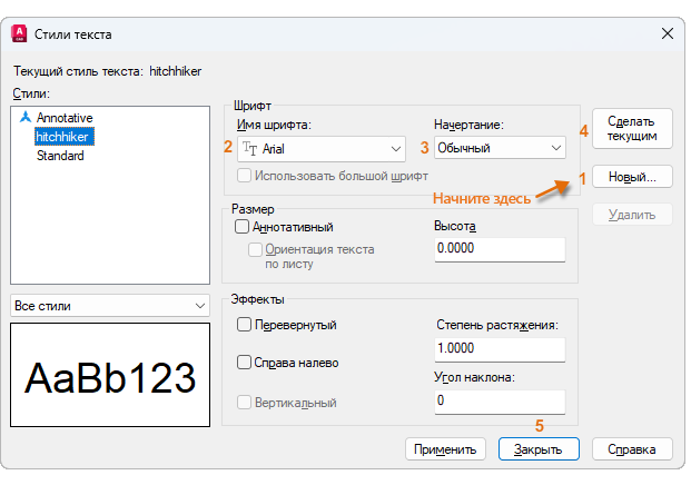 При создании стиля текста необходимо сначала задать его название, а затем выбрать шрифт текста и стиль шрифта. Порядок кнопок для нажатия показан на рисунке ниже:
