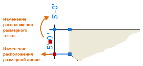 В этом примере, чтобы отобразить ручки размера, его необходимо выделить. После этого можно щелкнуть ручку в размерном тексте и перетащить ее в новое расположение или щелкнуть одну из ручек в конце размерной линии и перетащить размерную линию.